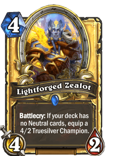 | Text | <b>Battlecry:</b> If your deck has no Neutral cards, equip a 4/2 Truesilver Champion. |