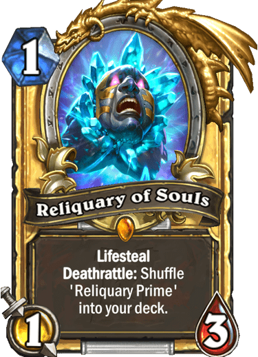 | Text | <b>Lifesteal</b> <b>Deathrattle:</b> Shuffle 'Reliquary Prime' into your deck. |